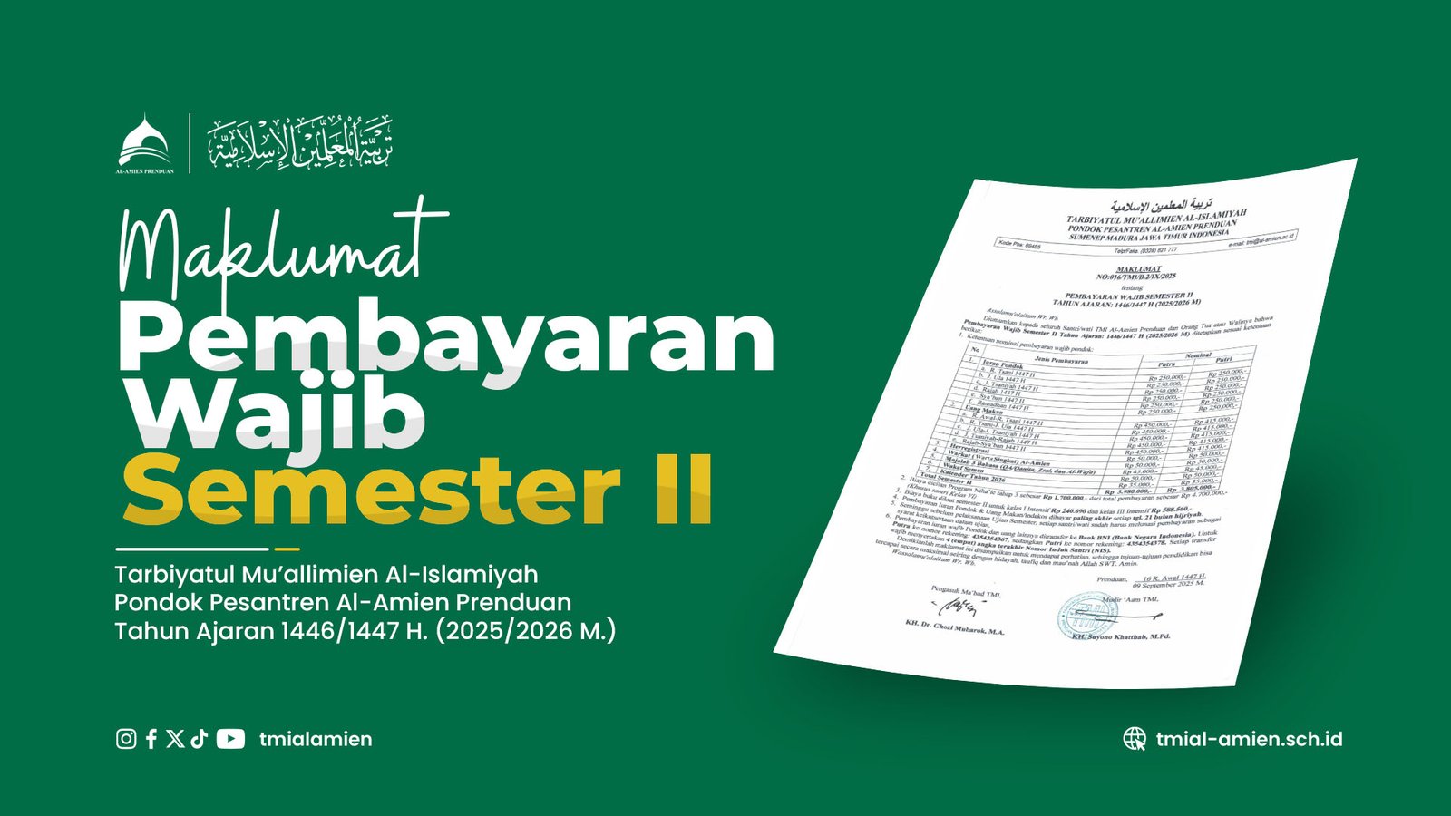 Diumumkan kepada seluruh Santri/wati TMI Al-Amien Prenduan dan Orang Tua atau Walinya bahwa Pembayaran Wajib Semester II Tahun Ajaran: 1446/1447 H. (2025/2026 M.) ditetapkan sesuai ketentuan berikut: